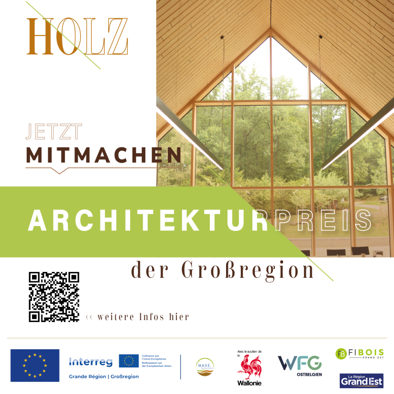 W.A.V.E. - Wood Added Value EnablerÜber 1/3 des Gebiets der Großregion ist mit Wäldern bedeckt. Diese Waldflächen beherbergen zahlreiche Akteure für die Verarbeitung und den Einsatz von Holz entlang der gesamten Wertschöpfungskette. Mit dem Klimawandel ändert sich die Baumartenzusammensetzung und damit auch die zur Verfügung stehenden Mengen an Bauholz. 29 Partner aus vier Ländern in der Großregion haben sich im Projekt W.A.V.E. - Wood Added Value Enabler zum Ziel gesetzt, die Entwicklung einer leistungsfähigen regionalen Holzbranche zu unterstützen, die auf der Stärkung der Wertschöpfungskette beruht und gleichzeitig die Verwendung von Holz als regionale und nachhaltige Ressource voranbringt. Architekturpreis Großregion 2026 gestartet – Jetzt mitmachen! Im Rahmen des Interreg-Projekts W.A.V.E. wird der Architekturpreis Großregion 2026 vergeben. Der Architekturpreis Großregion würdigt herausragende öffentliche und private Gebäude, Holzkonstruktionen sowie Innenraumgestaltungen, die zwischen dem 01.01.2021 und dem 31.12.2025 fertiggestellt wurden. Voraussetzung für Bauwerke ist ein signifikanter Holzanteil von mindestens 50 %, ebenso gelten entsprechende Anforderungen für Innenausbauprojekte. Ab dem 9. Januar 2026 können anspruchsvolle Holzbau- und Innenarchitekturprojekte aus der gesamten Großregion eingereicht werden – darunter die Provinzen Lüttich und Luxemburg (Belgien), die Region Grand Est (Meuse, Moselle und Meurthe-et-Moselle in Frankreich), Luxemburg sowie das Saarland und Rheinland-Pfalz (Deutschland). Sieben Wettbewerbskategorien: Die eingereichten Projekte werden in sieben Kategorien bewertet – von Neubauten über Sanierungen bis hin zu Innenarchitektur. Einreichungszeitraum: 9. Januar bis 14. März 2026 Ausschreibung und Informationen unter: Architekturpreis - Projet INTERREG GR W.A.V.E.